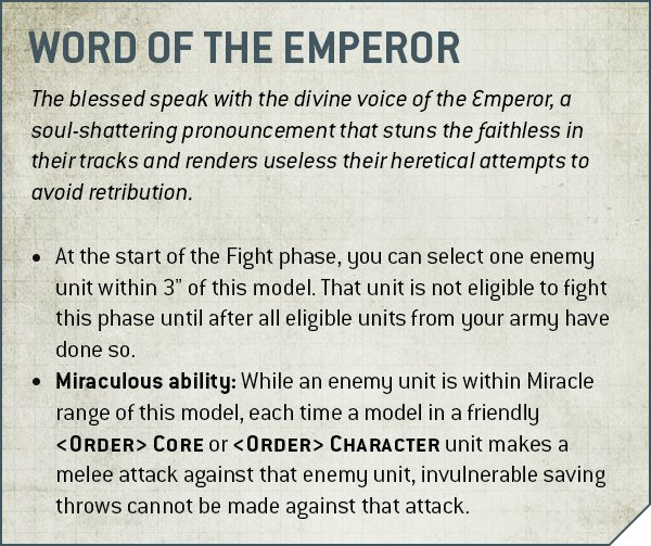 If your Warlord is on the battlefield, your first Miracle dice at the start of the first battle round is automatically a 6; additionally you can roll a D6 for each Command point spent using a Stratagem and on a 5+ it is refunded. A great bread and butter trait which lets you kick off the game with a good Miracle dice in hand, and keep up generating a steady stream of Command Points.
