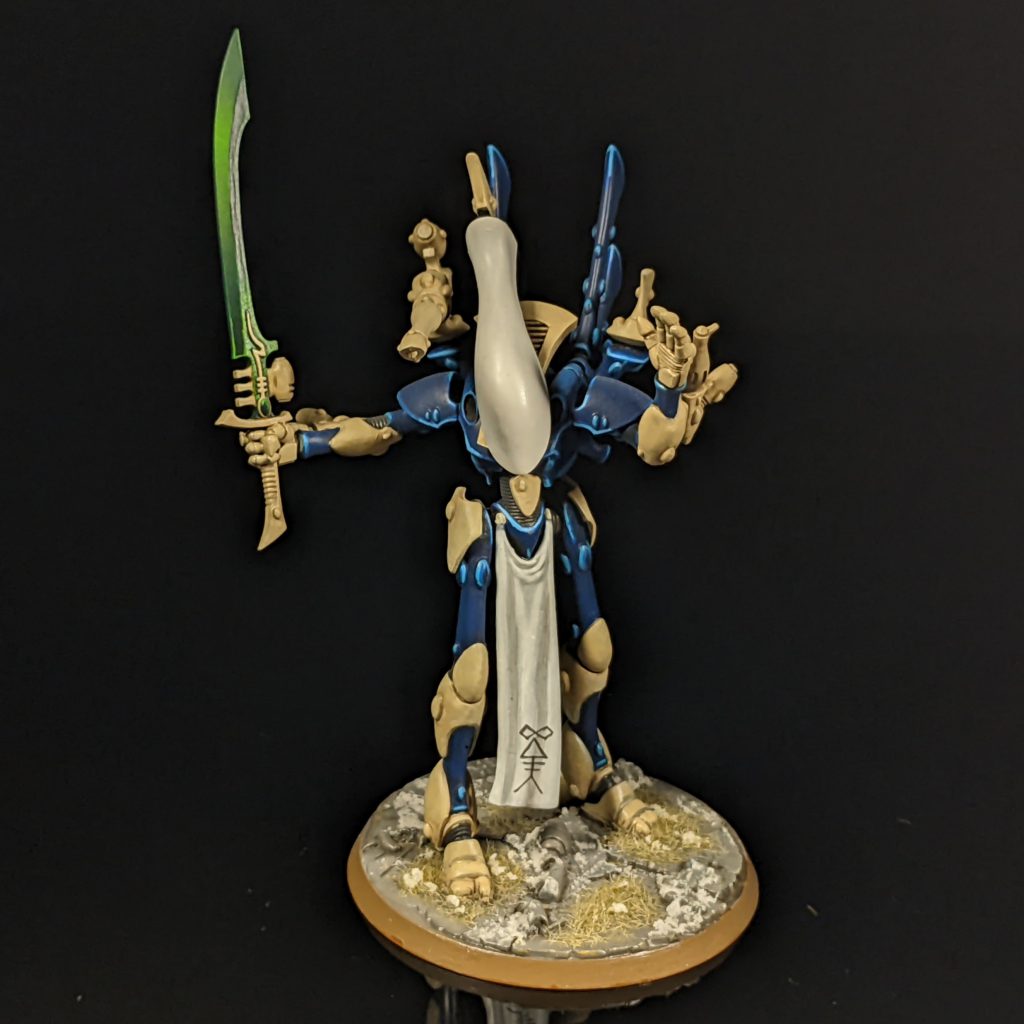 Is still a big scary melee monster, but a bit less so everywhere except the detachments that support him best. He’s durable at T11, 14W, 2+/4+ invulnerable and halving damage, but that’s lower T than in the index, and you no longer have access to Fortune or Fate Dice to throw at his save against key high-damage shots (though he’s a bit cheaper to compensate. You also lose the reliability of the auto-6 Overwatch. There is some trade for this mind, as his offence is now even scarier, jumping to S16 on the strike and S8 on the sweep, the latter a particularly important breakpoint. That leaves him as a serious consideration in either Warhost or Aspect Host, the former because you can use the Battle Focus bonuses to protect or lunge with him, the latter because the re-rolls give you the old reliability, and the ignore modifiers Stratagem makes him a complete nightmare.