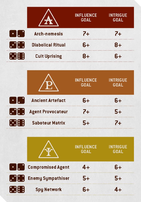 Once you know what kind of threat you're faced with, you'll also know how likely Influence and Intrigue are to thwart it. To fulfil these goals and thwart the uncovered threats, you'll need to gather Intrigue and Influence points, which you'll do primarily via Agendas, but also from Battle Traits and Requisitions (