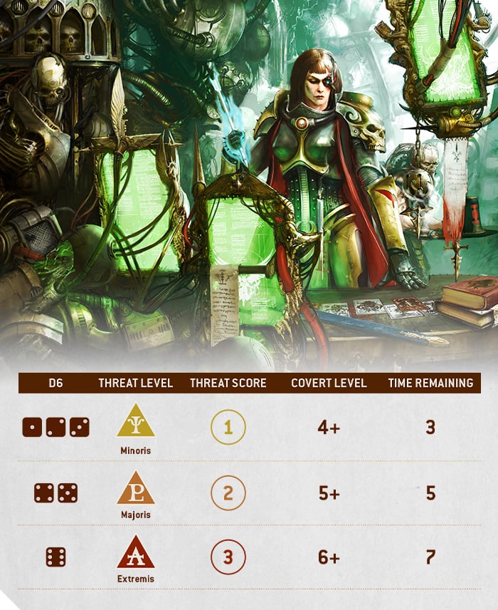 Each time you play a Crusade game, you'll generate 1 Investigation point to assign to any of threat that you haven't uncovered yet. If you need more, you can gain them through other means, like agendas. Once you've decided which threats to investigate, you'll pick a single threat with at least one Investigation point assigned to it and attempt to uncover it and discover what sort of plot you're trying to foil. To do so, roll a D6 and add the Investigation points assigned to the threat to the result. Equal or beat the threat's Covert level and you will have Uncovered it.