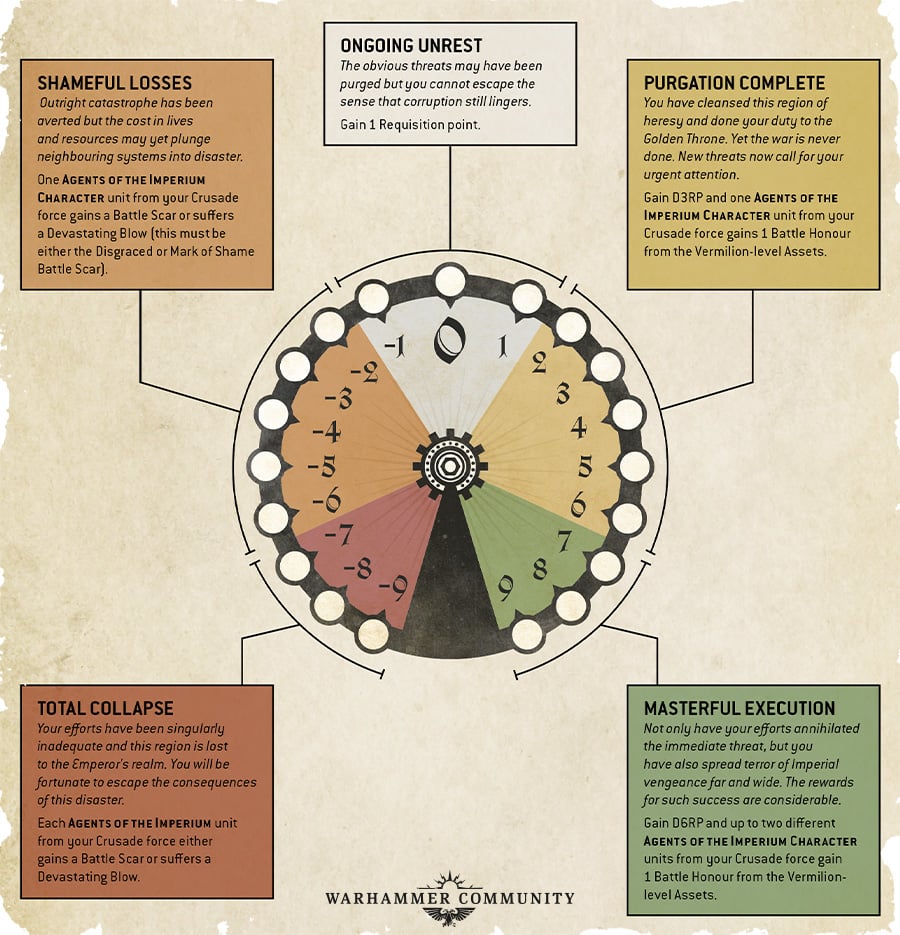 Once all Threats have been Thwarted or Fulfilled, your current Shadow Operation is complete. Depending on your sub-sector control level, you'll have to hand out Battle Scars or Devastating Blows for doing a shit job. For those that managed to do the bare minimum, gain Requisition for not being completely useless. Putting in the hard yards will net you lots of Requisition and a kick-ass Vermilion-level Asset or two.