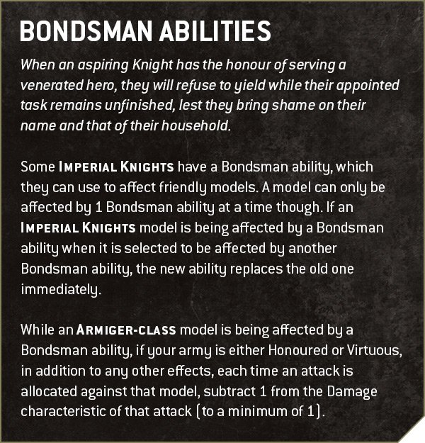 Bondsman ability is the biggest game changer of the bunch - giving Armigers Advance/Charge massively extends your threat range, especially in concert with a 9” Advance from