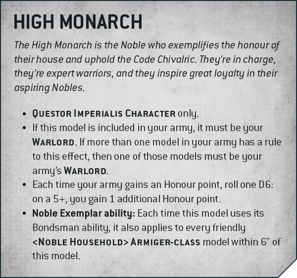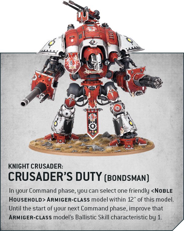 Any Imperial Knight detachment gains a number of abilities discussed below, and any Armigers within the detachment gain Objective Secured (because they're the closest thing you have to Troops).