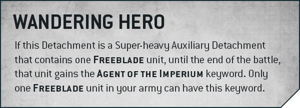 Wandering Hero rule. This applies to a Super Heavy Auxiliary detachment containing a single FREEBLADE unit, and grants them the AGENT OF THE IMPERIUM keyword, which generally means they won't break access to army-wide abilities or Secondary objectives. While you're obviously still going to sacrifice some amount of synergy to do this, there definitely are builds out there that would benefit from a gigantic robot (or three smaller, ObSec ones, this rule is