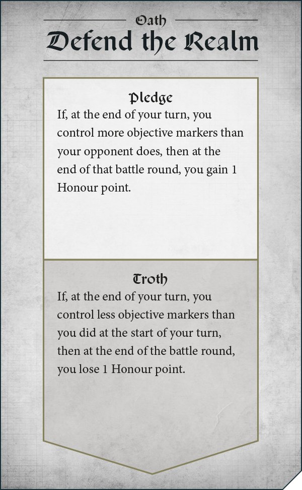 All Knight armies will need to make use of the Fight Phase to get stuff done, so this ranges from good to exceptional depending on how hard you build for it. It also rewards you for getting into melee - the Pledge here is for you to destroy two enemy units with melee attacks in during a Battle Round, which is definitely something you want to be doing in the mid game. However, you might find yourself triggering the Troth pretty often as well - you lose a point if any of your units fall back in a Battle Round, and since TITANIC Knights can do so with effectively no penalty, you'd normally do so quite often. Again, that doesn't massively matter here as long as you can stay stable in