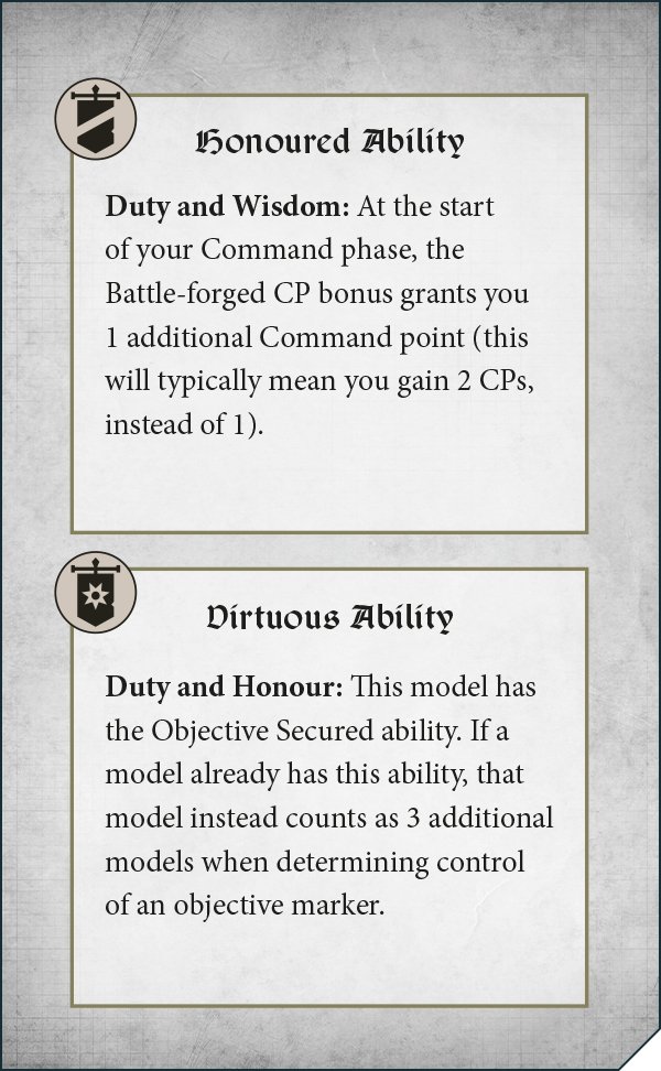 Note: The Honoured ability here is an oddity in that it's clearly army-level, but almost all abilities in this book that interact with the Code Chivalric are written in a way that assumes all bonuses from Oaths are all evaluated at a unit level. This raises the question as to what happens with this if, for example, you have a unit in your army with an effect that ensures they never count as Dishonoured - do you get the CP bonus here even when your army is Dishonoured as long as one unit has that ability? For evaluating everything else I've assumed the answer is no and that you have to be Honoured on an army level for this to count, but keep an eye on what the FAQ does for this.