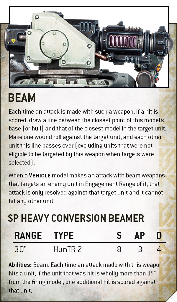 Beam weapons, which can hit multiple targets in a line. Whenever you hit a target with a Beam weapon, you draw a line from the closest point on the firing model’s base/hull to the closest point on the targets, and then check if that line passes over any other units that would have been eligible targets for the attack (so anything that would be blocked by
