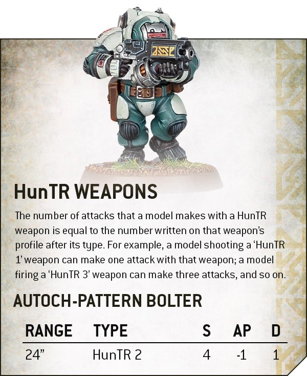 In addition to their unique rules, the Votann also bring with them a new weapon type: “HunTR.” Regrettable spelling aside, what we’ve got here is the long-awaited introduction of the mythical Type: GUN. Basically, a HunTR weapon shoots the number of shots after its type, unless you advanced, in which case you don’t get to shoot it. If you’re thoroughly infested by 40k-flavored brainworms, you could think of it as a Heavy weapon that doesn’t get a penalty if you move.