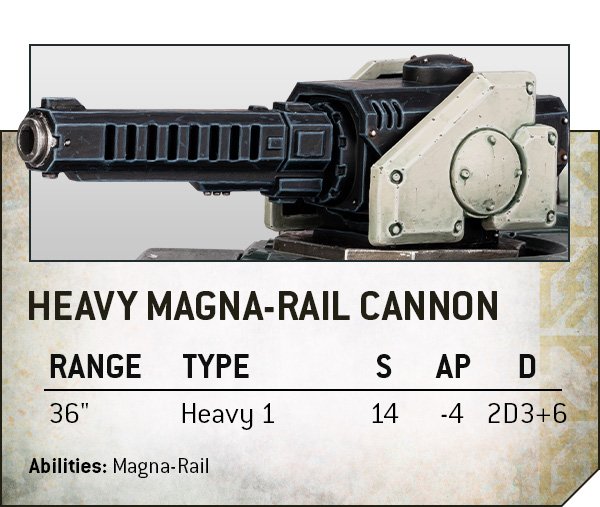 The main gun is where things go wild though, and realistically you’re picking either the heavy magna-rail cannon or the heavy Conversion Beamer (with the final ion option just adding lots more AP-2 D2 shots, fine but you already have plenty). The heavy magna-rail is equivalent to a railgun - it strikes for 6+2d3 damage at S14 AP-4, and because it’s a magna-rail weapon it ignores invulns, and can inflict spillover damage on smaller targets on a 6 to wound (which, you know, sometimes means 4+ to hit). The mix of being able to reliably make something big die hard