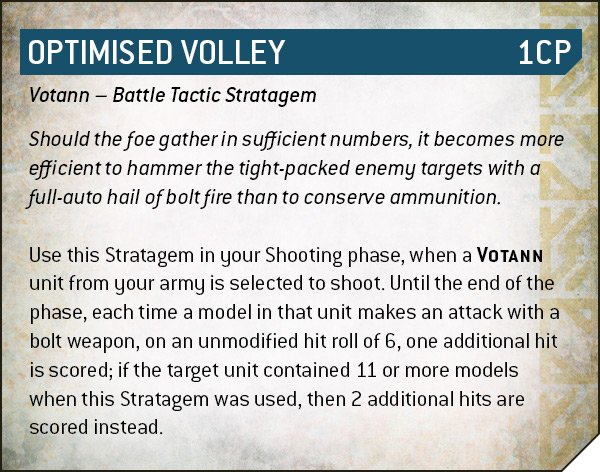 Condit: The one thing that potentially reins this in is the way this sort of rule affects various sorts of weapons: it gives the greatest returns to units that put out high-volume low-quality shooting, something that Skitarii Vanguard have and that the Votann largely lack. For reference, unbuffed Vanguard would deal an average of 2.2 wounds to a squad of Intercessors, and Original Recipe