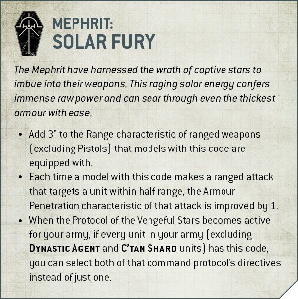 - He's got all the buffs and auras you'd expect of a Phaeron, but all of these effect NECRON CORE and TRIARCH PRAETORIANS.