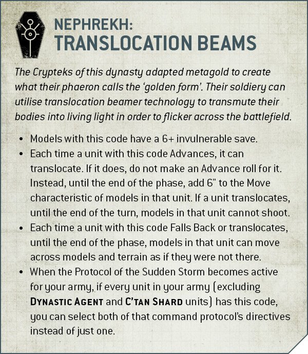 wild on C'tan shards thanks to their Necrodermis rule preventing them from losing more than three wounds in a phase. That's all that really needs to be said about that, and Dimensional Translocation is just a consolidation of a bunch of effects that would otherwise have been printed on lots of sheets, so again we don't need to go deep on it. Let's look at the two big hitters from this section.