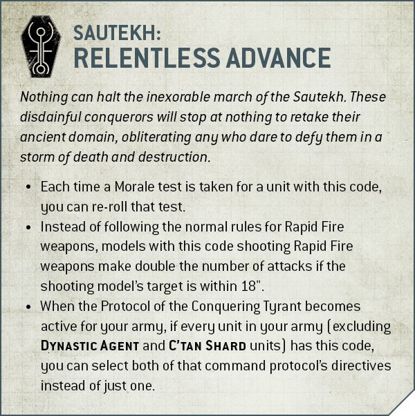 Done with the old, now for the new. Command Protocols are a new ability that grants changing bonuses to your army over the course of the game, as long as you've kept your command structure in place. The ability appears on the datasheet of all units