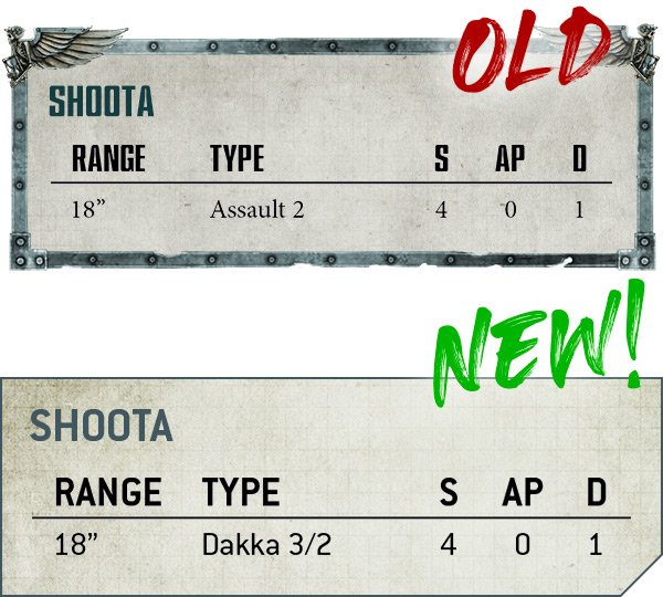 Dakka! Dakka! Dakka! Rule and have replaced it instead with a new weapon type - Dakka. Dakka weapons have two values for the number of attacks they make - one for when the weapon is fired at full range and the other for when it is fired at half range.