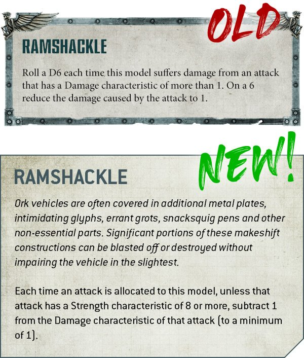 The Ramshackle rule returns for Orks but in a changed fashion. Rather than letting you reduce damage on a D6 roll of 6, Ramshackle now reduces the damage of incoming attacks by 1 if the attack has a Strength characteristic less than 8. It also now appears on