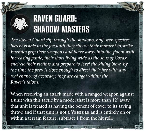 The Raven Guard were the only Chapter that saw a nerf to its Chapter Tactic, in part because an army-wide -1 to be hit applying to vehicles has been thoroughly proven to be a horrible mistake (