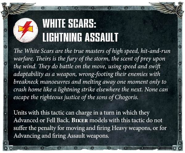 On a more serious note, jump pack and bike characters who want to tangle in melee look really appealing with this. Obviously Wolves and Blood Angels still have great support for them, but the extra mobility means that White Scars are going to be one of the better ways to do this within Codex Marines.