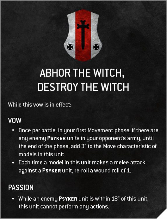 Uphold, but against opponents with limited ranged threat would definitely consider switching to one of the other vows as appropriate, as the up-close threats all sport invulns. The list packs in a trio of hyper-deadly melee units, with the VanVets in particular planning to get souped up with