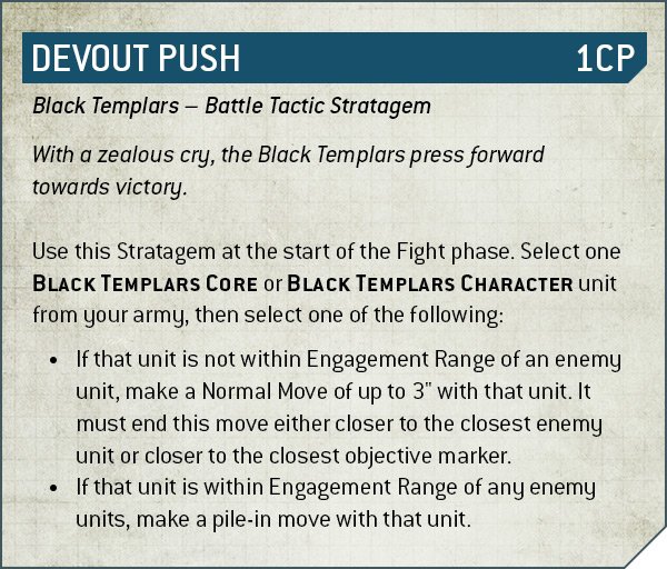 Devout Push, previously the lynchpin of Black Templars’ strategy. Warhammer Community went ahead and spoiled this one, so you may have already seen it, but it’s still worth discussing in detail. First the bad news; it no longer lets you pile into a combat you weren’t already in. The new version happens at the start of the Fight Phase and now lets you