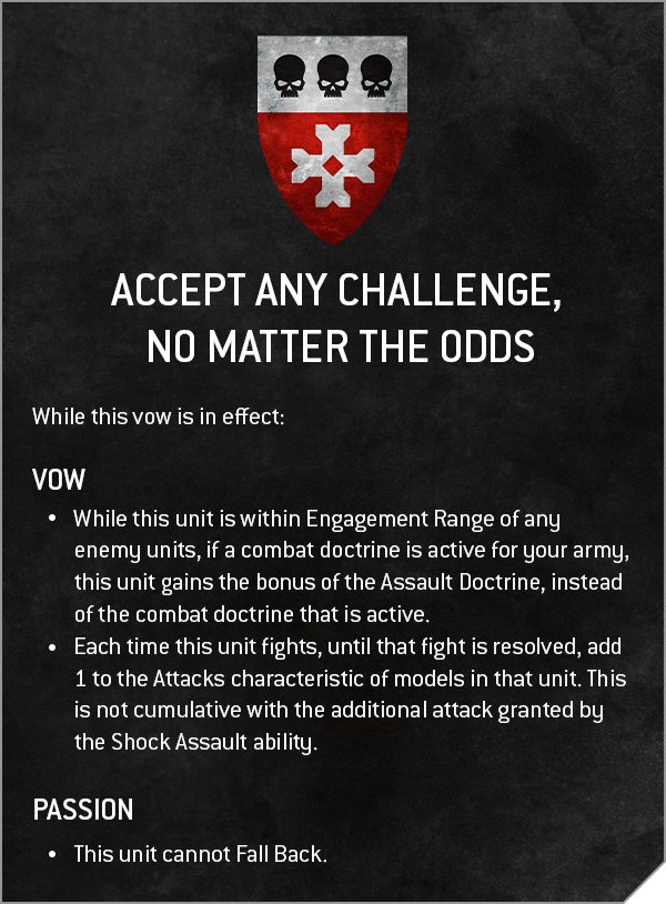 The Black Templars lack a superdoctrine in the style of the First Founding Chapters - instead, your reward for playing a pure Black Templars army is access to Templar Vows. These give all units with the