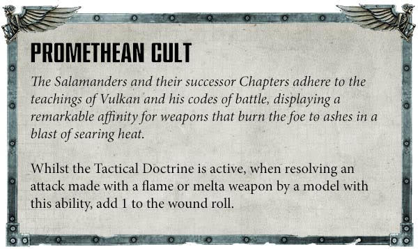 - If every model in your army is SALAMANDERS or are from the same Salamanders successor chapter, models with the Combat Doctrine ability gain the “Promethean Cult” ability. This is an improvement to the Tactical doctrine and we’ll talk about that in a moment.