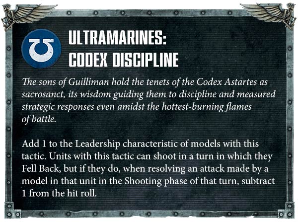 The Ultramarines Chapter Tactic is wholly unchanged. The ability to Fall Back and still shoot (albeit at a -1 to hit penalty) is quite powerful, and extending it to vehicles will surely be useful for those that want to run legacy vehicles like the Land Raider and now no longer have to worry about those vehicles losing a turn to being charged. If you are willing to run Guilliman in a Supreme Command or Superheavy (not aux) detachment, even he benefits from it. Lastly, there are are a few ways now to avoid the -1 to hit penalty when shooting after falling back, which can lead to some hilarious situations where a Leviathan falls back and then unloads 20 storm cannon shots at BS2.