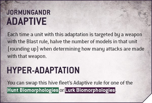 Primaris Kevin: As awesome as the Hive Fleet Adaptations are, none of them hold a candle to giving a 5++ and reducing incoming damage by 1. It synergizes with Maleceptors (more powers), makes every monster significantly harder to kill, makes the Synergistic Imperative of Zoanthropes less necessary, has a lot of powerful traits and Stratagems, and has minimal downsides.