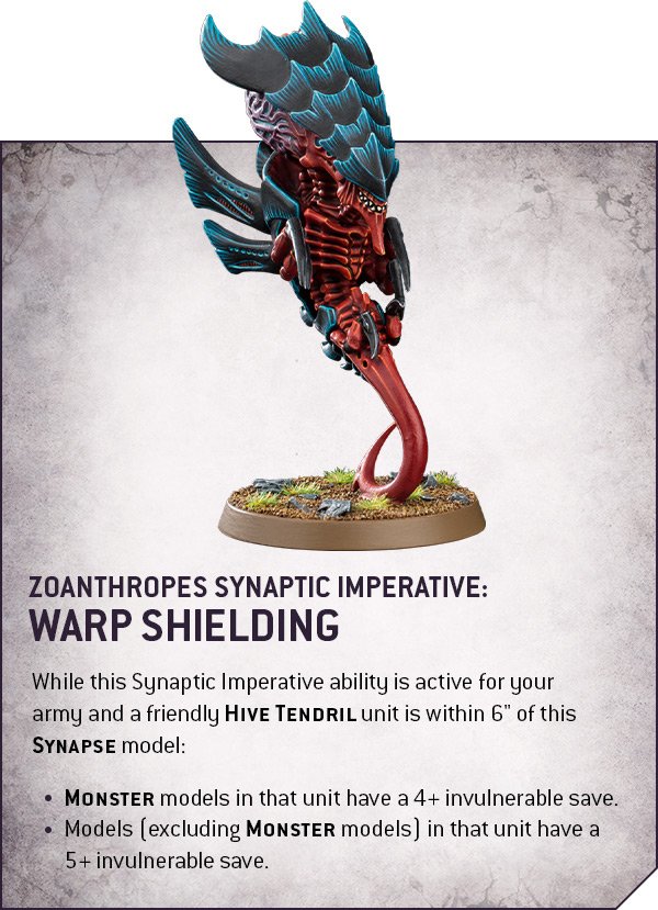 - Synaptic Imperatives: Powerful, flexible and flavourful, Synaptic Imperatives represent the shifting will of the Hive Mind on the tabletop, helping your army adapt to whatever is thrown at you.