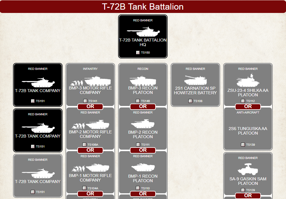 An example Formation structure in Team Yankee. Black units are mandatory, while grey ones are optional and may represent a choice between several available unit types. Credit: Battlefront