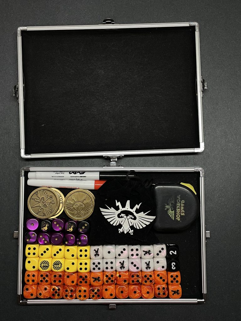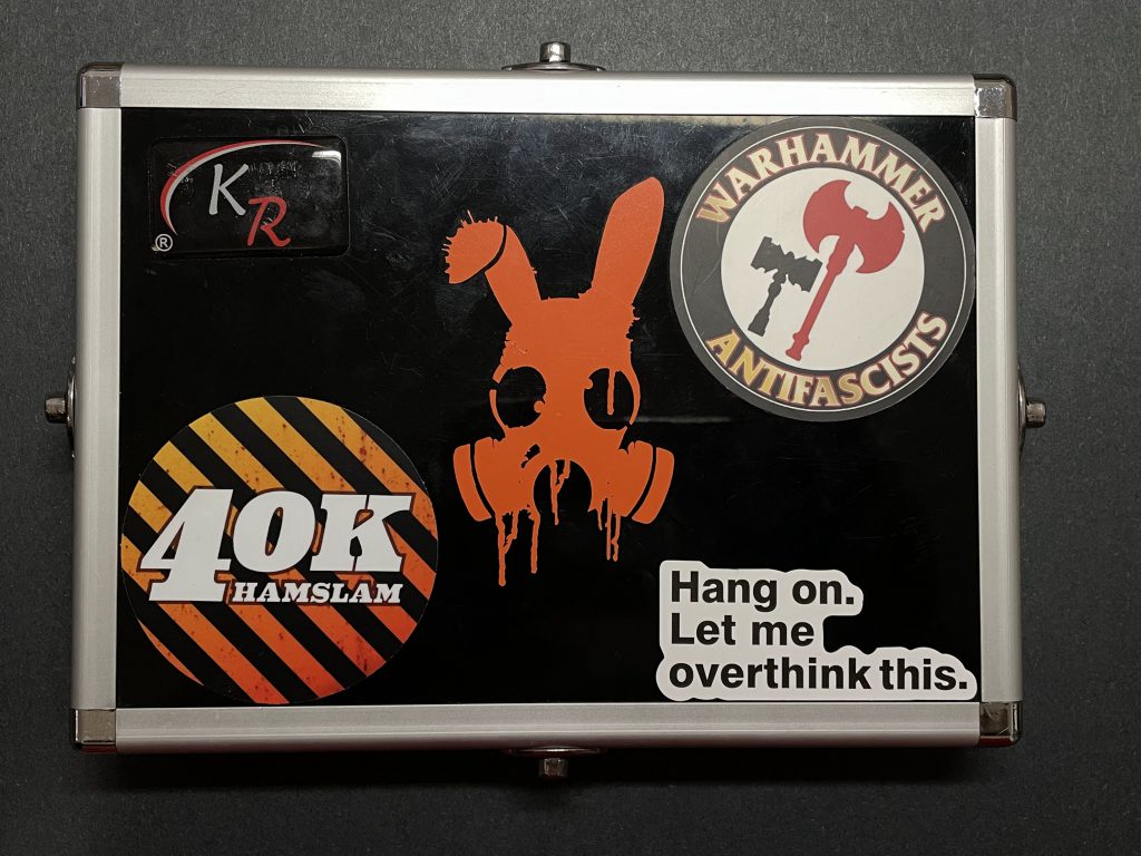 metal dice case/accessory tray from KR Multicase. My friend Ben has one and recommended I get one and it's just perfect. It holds all my dice, objectives, markers, and my tape measure and it can be used as a dice try during games. Brilliant bit of kit, as the Brits would say. Some great stickers from friends and my Legalized Mischief logo and it's mine. The case itself is only £15 though I'm pretty sure shipping at least doubled the cost. It's worth it. Get one.