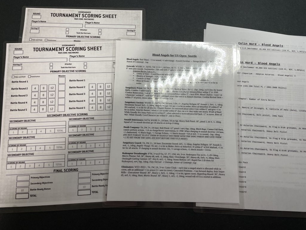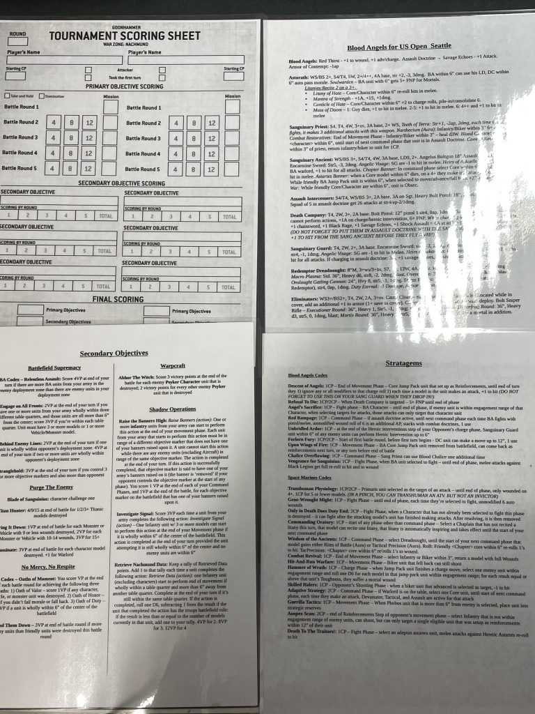 - Side A: Scoresheet for keeping score in game (I use Goonhammer's)