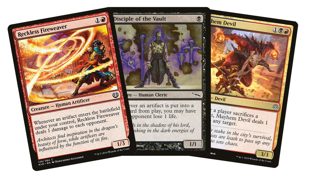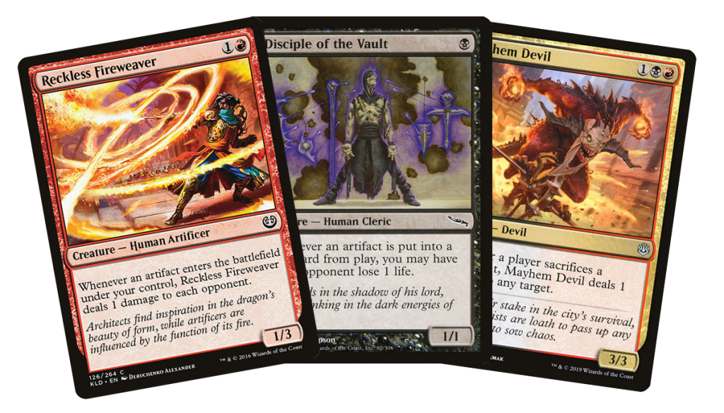 Havoc Devil. Each of these either generates lifeloss or a ping on an artifact entering play, going to your graveyard, or being sacrificed, and all of these things will happen a lot.