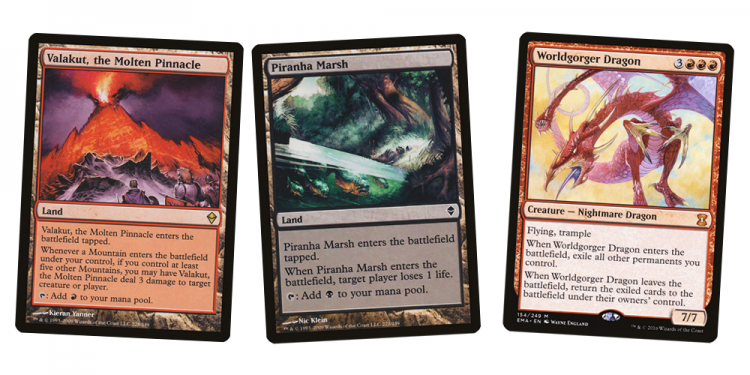 Golos fetches lands, so one potential win con is a land based one. For fun, I made a high powered gate deck, but gates aren’t really competitive. There are some lands that can kill people, among them Valakut and Piranha marsh, by repeatedly entering and leaving the board, typically via Worldgorger Dragon / Animate Dead lines. We could use Golos to fetch one of these lands and assemble the combo, or run it as a backup combo. But because of the triggering of Worldgorger dragon, if someone destroys the dragon while it’s enters play effect is on the stack, we lose all our permanents. Risky.