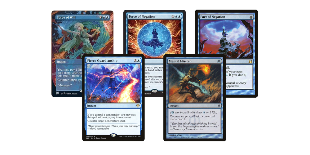 For protection we have 5 colors to choose from so can go with the best of the best, the zero-cost counterspell suite that is nearly an auto-include at this point: Force of Will, Force of Negation, Pact of Negation, Fierce Guardianship, Mental Misstep. We’ll definitely want Counterspell and Mana Drain, as well as Swan Song and Flusterstorm. Narset’s Reversal is a counterspell that doesn’t actually counter, and also can allow you to “steal” a spell on occasion, and Dovin’s Veto is an uncounterable counterspell. Red Elemental Blast we’ll throw main deck, depending on your meta, you may also want Pyroblast, and Dispel.