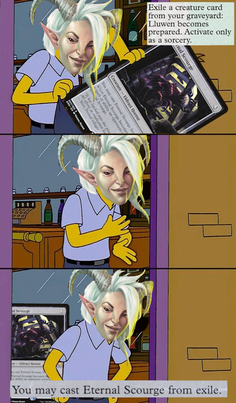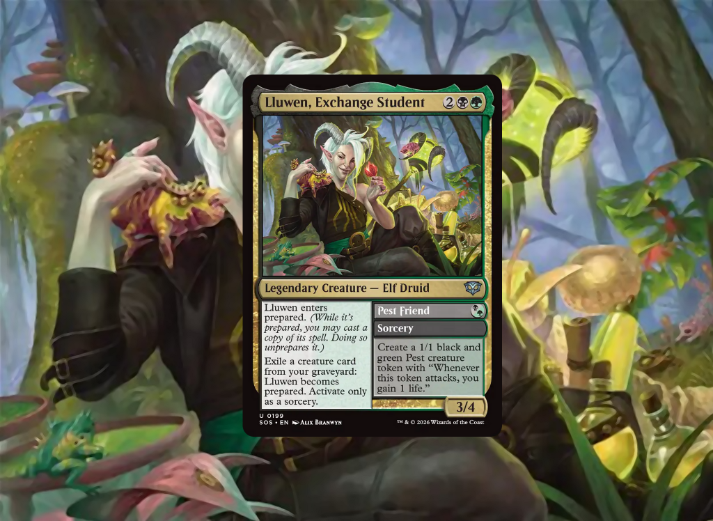 Given his core mechanic is so new, it's worth talking about Prepare before we dive into what we're doing with Lluwen, specifically. Any Creature with a potential Spell to cast exists in a Boolean state: Prepared, or Unprepared. While a unit is Prepared, the Instant or Sorcery you see on the right side of their textbox exists as a Spell in Exile, waiting for you to cast it during an appropriate timing window. When you do, and that Spell enters the stack, that Creature becomes Unprepared, and that Spell ceases to exist beyond the stack until its originator once again becomes Prepared. There's a few key takeaways from this: The Spell is cast from Exile, it's entirely repeatable so long as you re-Prepare, and (from my understanding as a judge) the Spell is