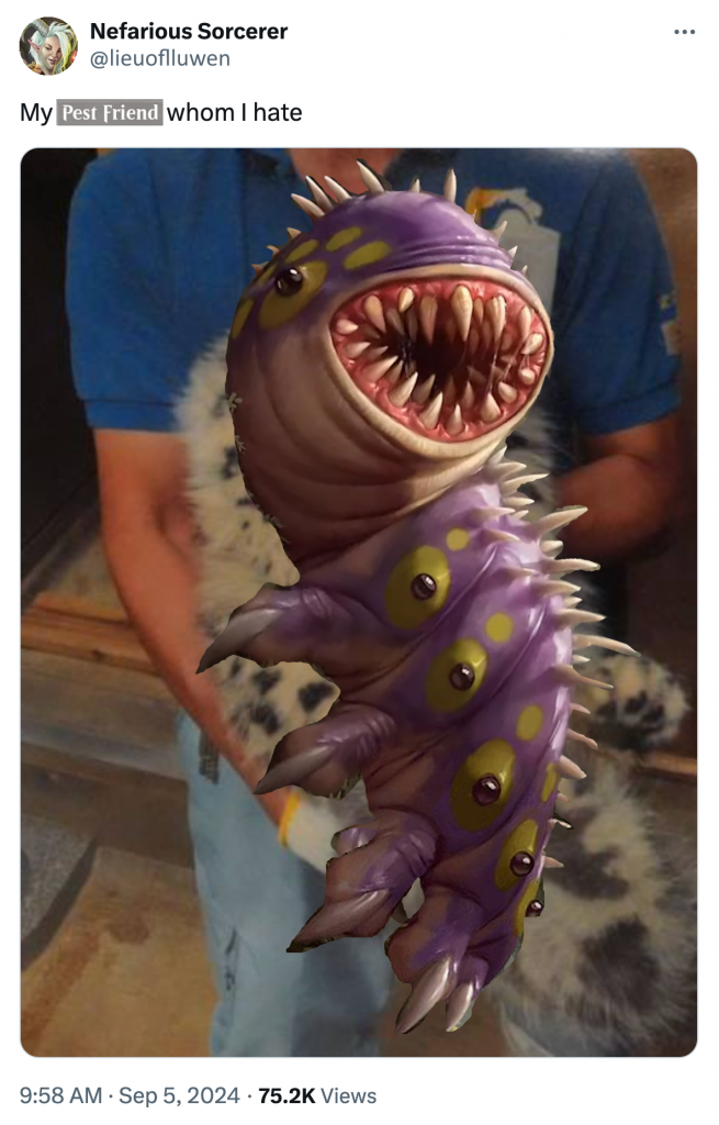 Lluwen, Exchange Student//Pest Friend. This Lorwyn native may have the trappings of an uncommon, but he exists in the context of his constituent text; between managing to be in just the right colors, with Pest Friend having just the right cost for its effect, this Commander enables a highly nontraditional Storm strategy in Green & Black. For those Prismari mages who are feeling a little Witherbloom-curious, come home to roost here, as we