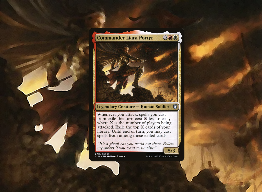Commander Legends: Battle for Baldur's Gate. First, it's specifically cast, and not play, unlike so many modern impulse draw Commanders. That means she can have issues with Lands (which we'll get into), encouraging you to have as many in hand as possible. Second, she's a whopping 5 mana, meaning there's both problems with her coming online period, and the utter dismay one has at casting her after removal for 7 mana. This isn't a Commander you want to be casting twice, and because she doesn't readily find Lands on her own, you're required to consistently make Land drops outside of her extra 3-6 cards per turn.