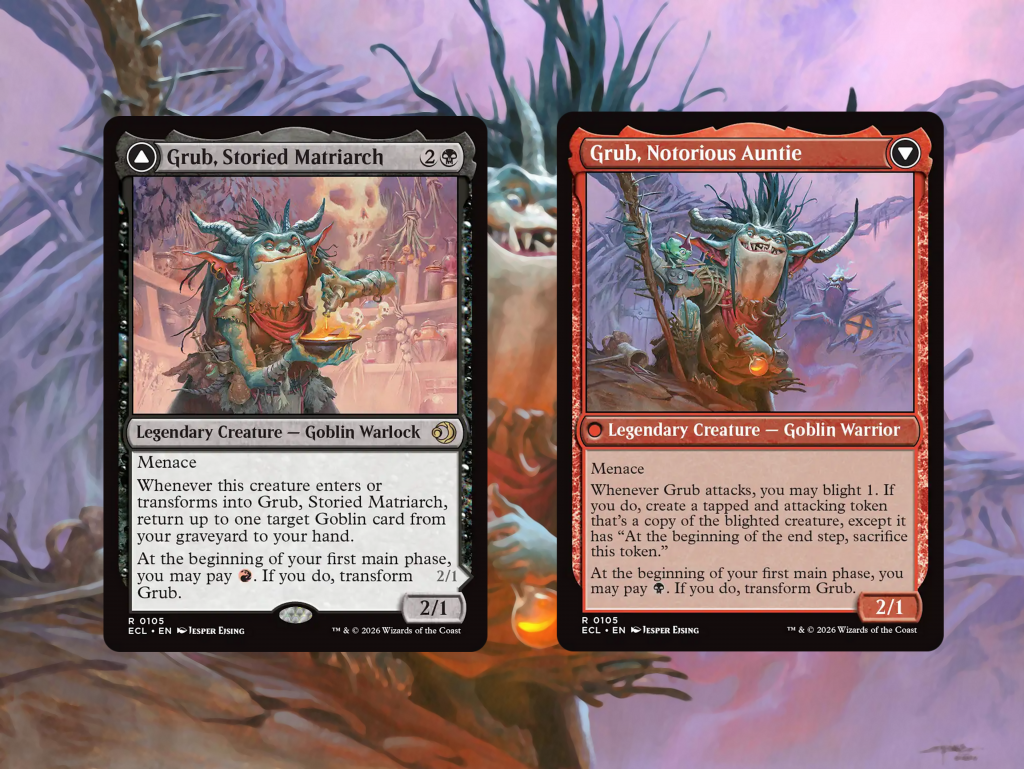 Grub, Notorious Auntie. On the surface, reading her front face, you might assume this is a Goblin typal deck, as indeed we see that to be the case on Moxfield and aggregators like EDHREC. It takes a bit of time to realize, however, that we've actually built Grub as a phenomenal, resilient, and oddly fast combat combo deck, based instead on her back side. It's going to take some explanation, and a bit of creative piloting, but I assure you, "This is not a Goblin deck." It's far better.