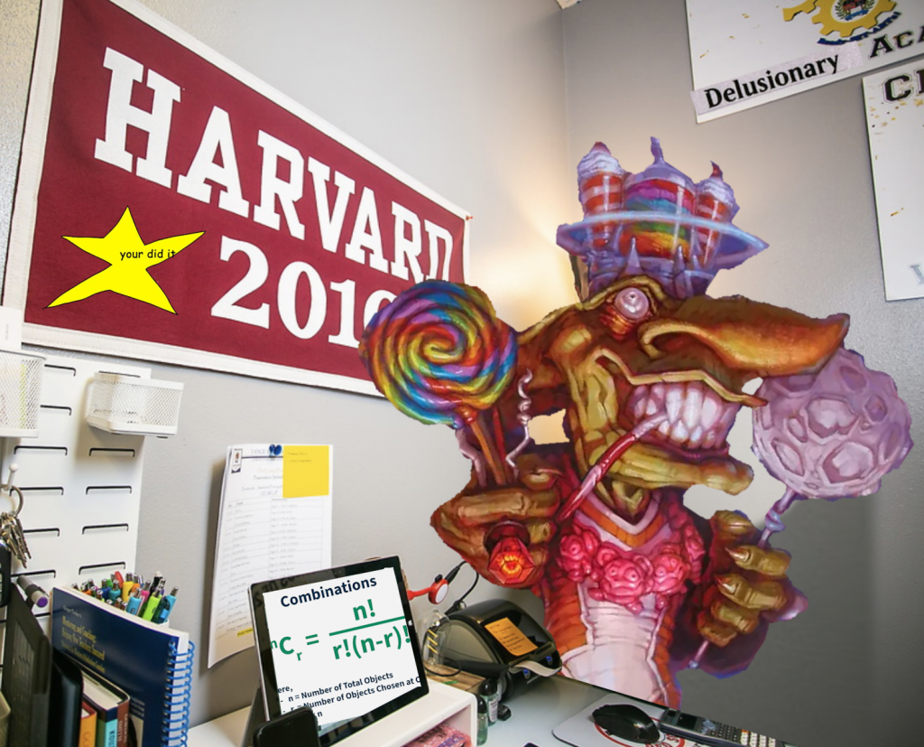 Oh, Stickers. If you choose to, a player can arrive to a game with 10 of these hellish additional game objects, and pick three at random to use throughout. If we're playing optimally, 5/10 of these sheets have name stickers with four vowels, 3/10, with five vowels, and the glorious 'Delusionary' with six. The 10th sheet will have three vowels on a given word, but because you'll always get at least one other sheet with four or more, it's irrelevant. So, pulling our first sheet, we have an average potential produced mana value of 4.4 Red mana. Given we have three shots though, it's time for math: We can use a combination sum equation of 13 (meaning at least one number chosen is 5 or 6) to find that 38/120 possible three-sticker permutations will cause our Mind Goblin to make 5+ mana that game, which we'll use as our target value. 31.67% of the time, you've got a Seething Song on legs, but