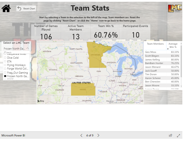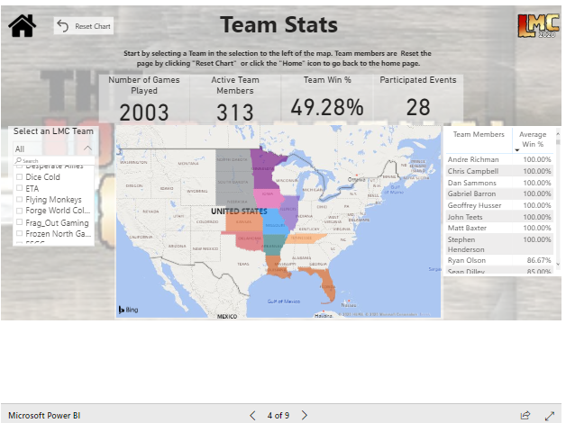 The Team Overview page features the similar national breakouts but then lets you zone in on specific teams, their membership, location, performance as a team and individually, and their general activity level within the conference. I really like this feature as it helps to push that cross-team performance rivalry and, perhaps more importantly, gives you the option to back up your intra-team shit talk with data. A nice future addition might be the capability to compare team vs team in a sort of Big Ten vs ACC challenge type of scenario. A data-backed Frozen North Gaming vs Warhogs annual challenge would be an addition to this community that no one is truly asking for and yet, may just be magical.