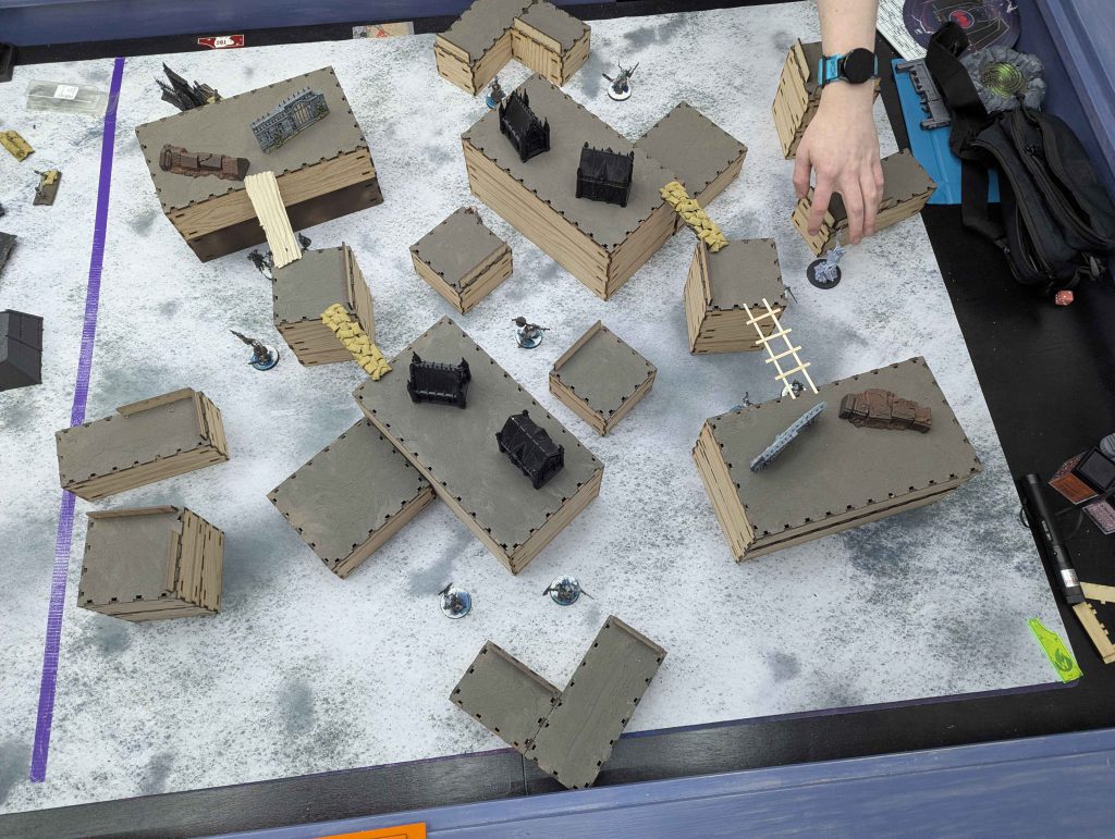 Norman: The bad news with all of this is our layout for Adepticon is now locked down to these pieces. We can move some stuff around but this is it. We need to give folks time to prepare the tables for the event and this is the best we’re gonna get. With that in mind we have a ton of work to do getting ready! Ryan and I have to print all the player placed terrain and some objective markers since those are obstacles now in order to provide some more cover. Massive shout out to our buddy Callum, who’s been invaluable in our prototyping process by making our prototype set for our playtests. Below is a picture of our testing table.