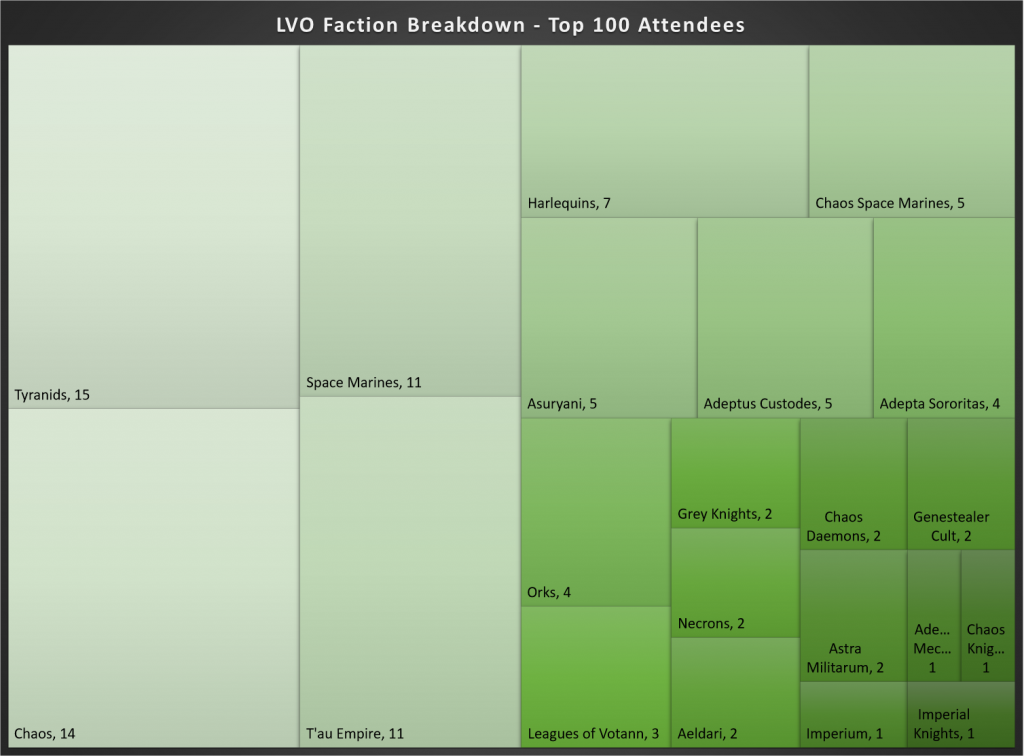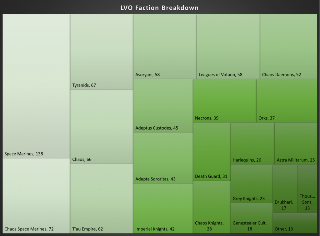 Falcon: As of the time we put together this article, just shy of 1000 players had submitted their lists for the LVO, including 55 of the Top 100 in the ITC and 95 of the Top 200. Given that this was a season filled to the brim with massive super majors outside of North America it is intriguing just how many people are making the trek across the ocean to compete. Jeremy Curie of Stat Check put together the below faction breakdowns for us so we could compare what the entire field brought to those at the top of the ladder. You can check out his article on the overall meta