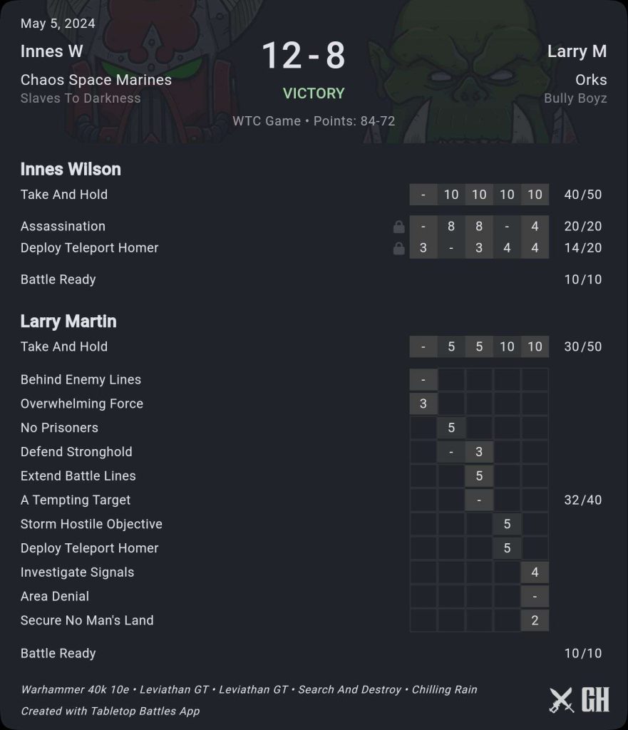 No idea if going this hard stays viable once the initial Ork excitement dies down a bit, but right now it's got some real moves, with the added bonus that Be'lakor keeps it reasonable against gunlines. I'll confess to having been a little worried that Daemons got no love in the dataslate, but hits to some of the top predators have clearly helped them quite a bit, as they've shot up in our stats, well done David for contributing strongly to that with his 5.5-0.5 finish.