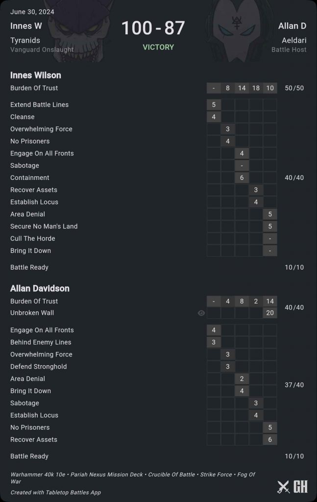 - 3rd - Kyle Fallier - Deathwatch (Black Spear Task Force): Blackspear focused on using the Tome of the Ectoclades to unleash a turn of Inceptor/Centurion hell. Came within 2VP of winning the whole thing, which is extremely impressive!