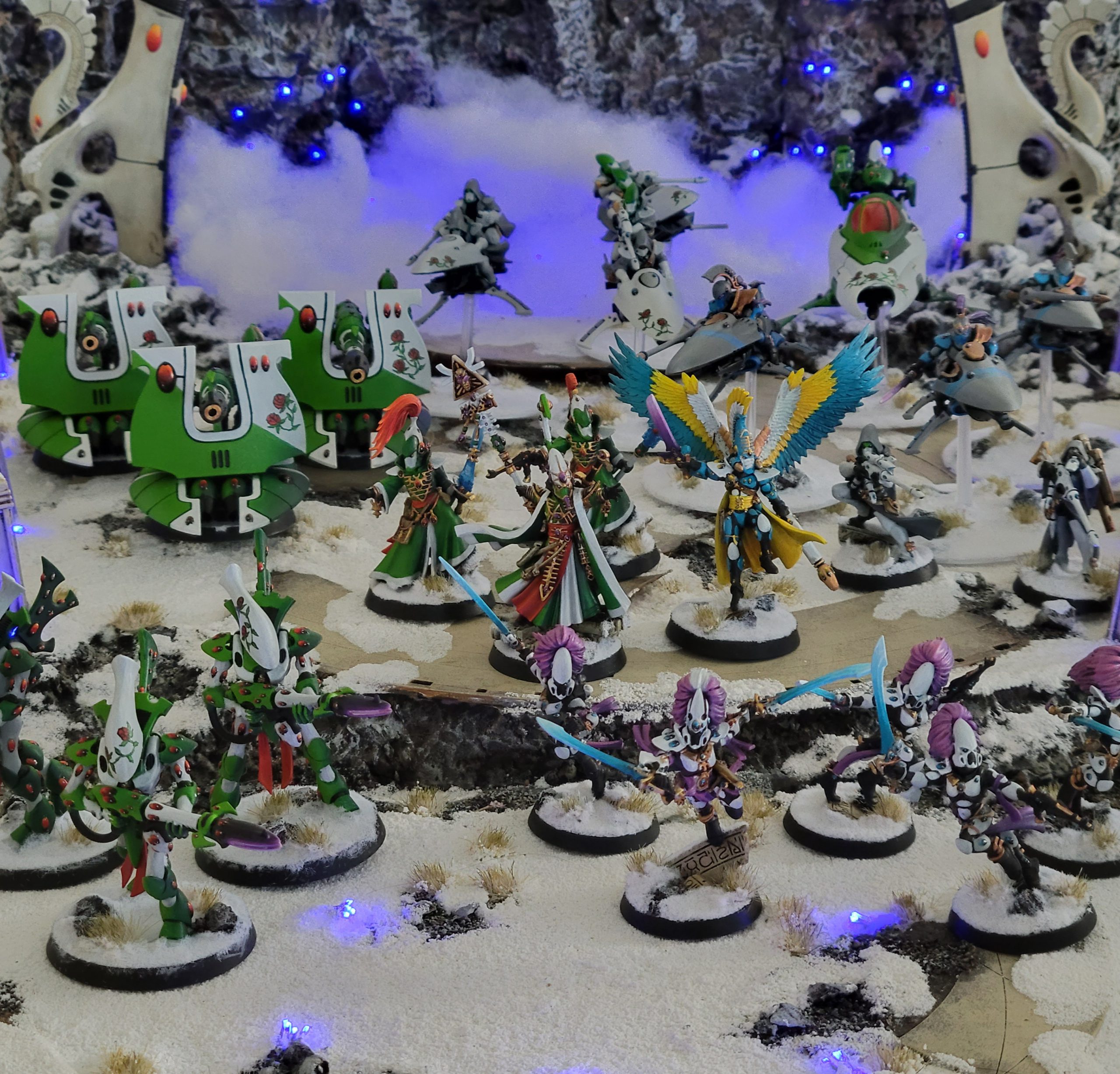 Commander in Coldstar Battlesuit [8 PL, -2CP, 175pts]: 5. Exemplar of the Kauyon, Advanced EM Scrambler, Burst Cannon [10pts], DW-02 Advanced Burst Cannon [1 PL, 15pts], High-output Burst Cannon [15pts], Plasma Rifle [10pts], Plasma Rifle [15pts], Stratagem: Emergency Dispensation [-1CP], Stratagem: Promising Pupil [-1CP], Target Lock