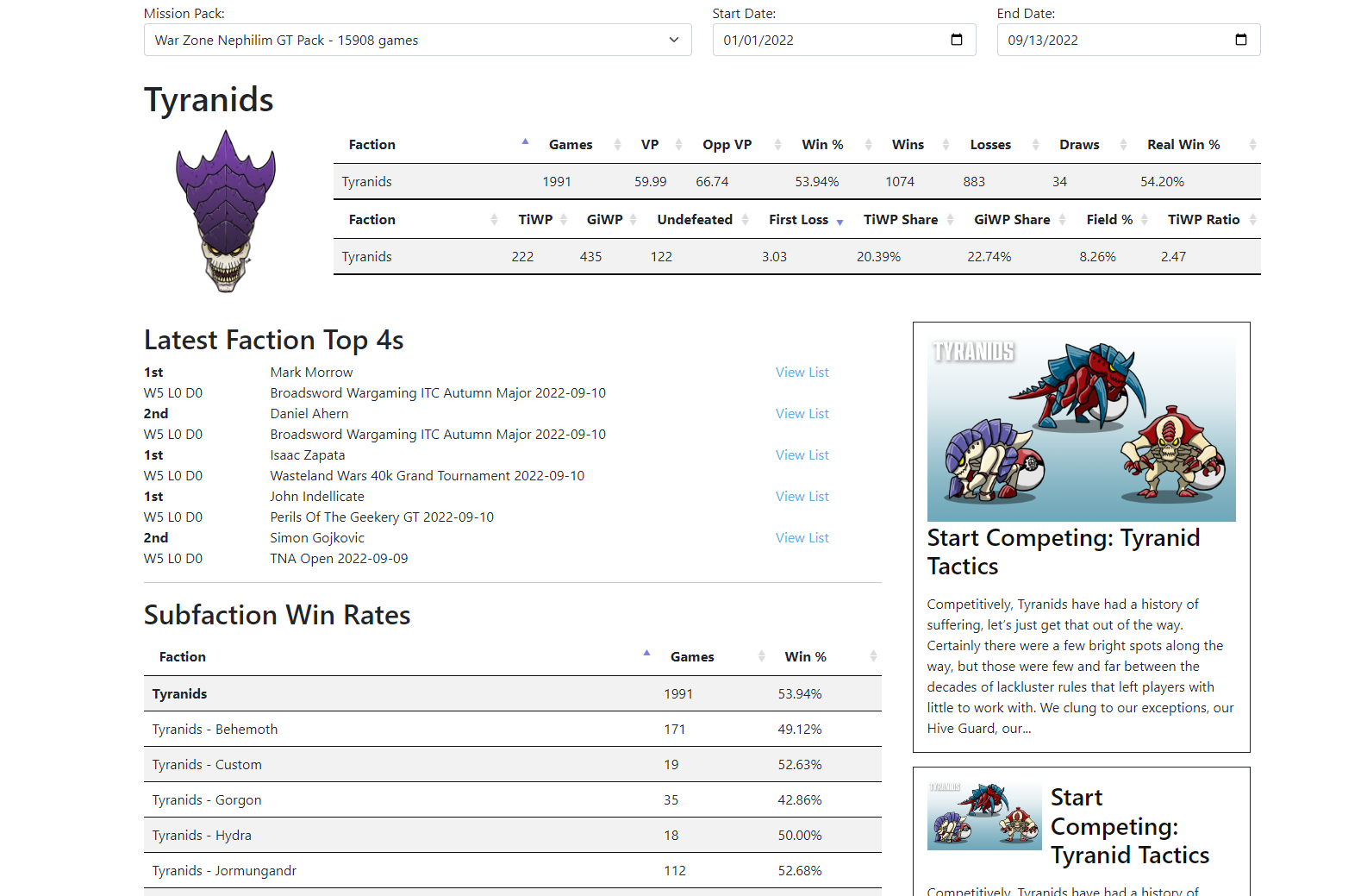 Faction Pages, which allow you to get a quick understanding of how the faction is doing at events, see the latest top 4 lists from the faction, look at subfaction win rates, and see the latest competitive articles for the faction (including the most recent Start Competing article). We also publish faction v faction win rates on these pages in order to make sure you have everything you need.