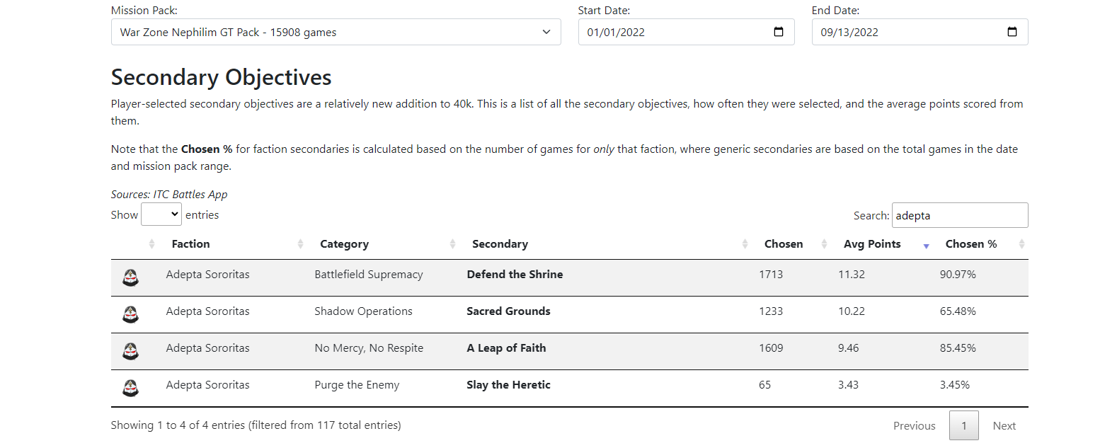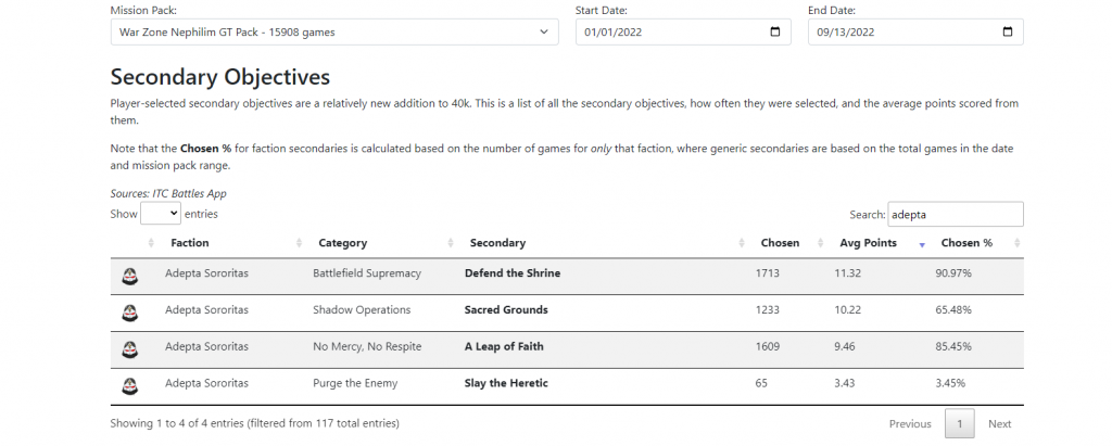 - Secondary Scoring shows you the complete list of secondary objectives in the game and the average scoring statistics for each. This is a sortable list, and you can use the search bar to refine it to just a specific faction.