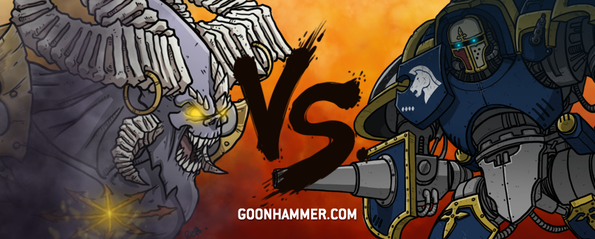 It's another gigantic throwdown here, and one that the mission makes pretty interesting. On killing power alone, this feels like a game that the Knights can win - the targets they're going after are certainly not soft, but there are a lot of big melta shots here, and really only a few need to punch through to seriously hurt the big Daemons. The Hunters of Beasts Helverins are also fantastic here, somewhat scary even to Be'lakor. Finally, once battle is joined, the Noble Combatants Warglaives are pretty concerning - get ganked by a couple of these with Pack Tactics up and it's going to be a bad time for the Daemons. There's also quite a few things in the Daemon list that don't really do their job to the full here - the Flamers won't do much damage, and the Exalted Flamer doesn't push them over a break point, and the relic on the Keeper of Secrets is basically a dud.