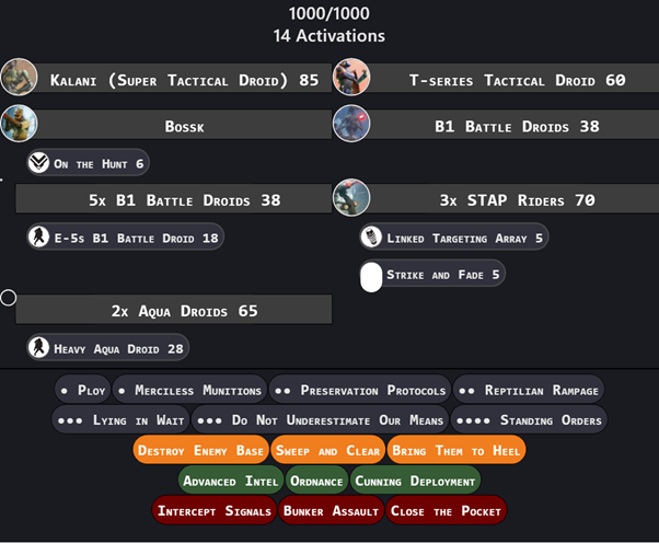 This list has a powerful alpha strike thanks to the aforementioned Aqua Droids the 5 E-5s models with their 2 dice,