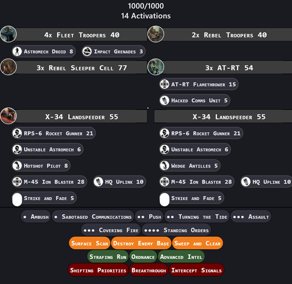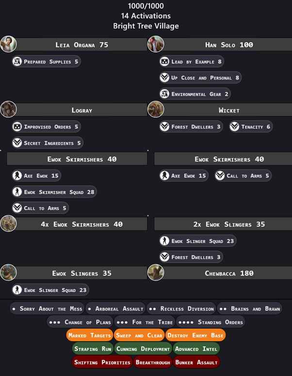 Low Profile keyword, some burnt Ewoks were likely during the match up. An interesting and seldom seen upgrade in Hacked Comms was also placed on all three AT-RTs. This allows the unit to be issued an order if an enemy unit is issued an order within range 1 of it. This is a great tactic for stopping all of the Ewoks close by from running away before the AT-RTs can activate.